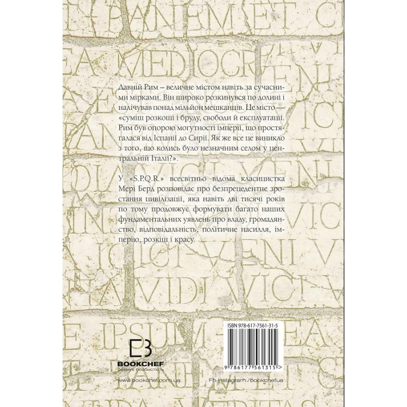 Давній Рим був величним містом навіть за сучасними мірками, що широко розкинувся по долині, налічував понад мільйона мешканців. Це місто — «суміш розкоші і бруду, свободи і експлуатації. Рим був опорою могутності імперії, що простягалася від Іспанії до Сирії. Як же все це виникло з того, що колись було незначним селом в центральній Італії?» У «S.P.Q.R.» всесвітньо відома класицистка Мері Берд розповідає про безпрецедентне зростання цивілізації, яка навіть дві тисячі років по тому продовжує формувати багато наших фундаментальних уявлень про владу, громадянство, відповідальність, політичне насилля, імперію, розкіш і красу.