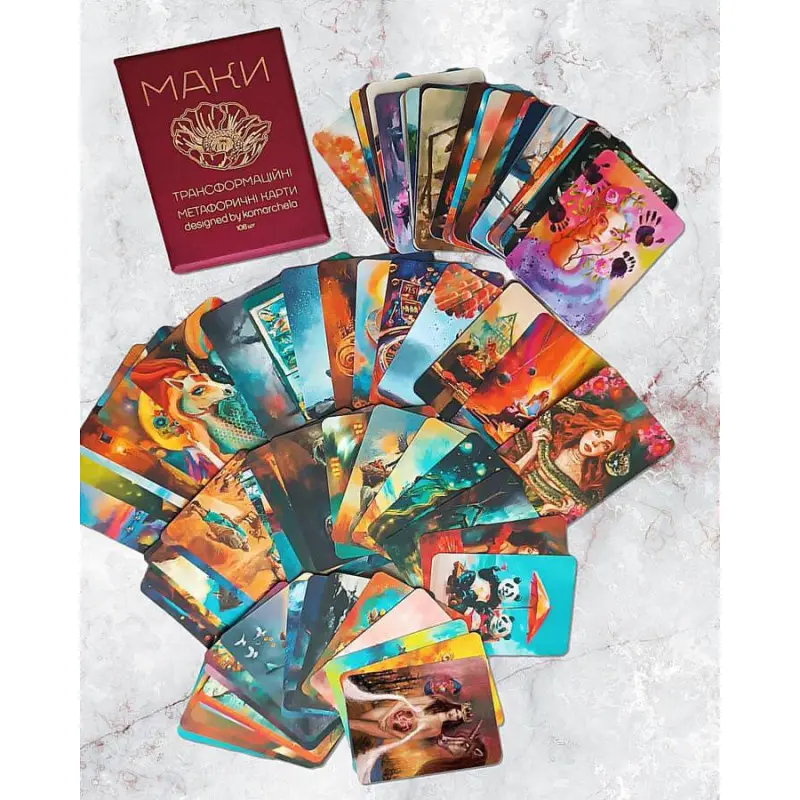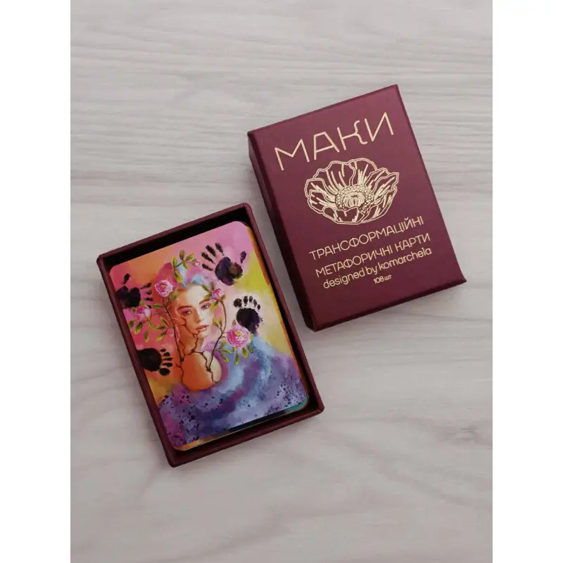 Колода метафоричних карт «Маки» складається із 108 карт, кожна з яких намальована вручну і містить унікальний сюжетний малюнок. Карти містять багато символів, метафор, ситуацій. Зрозумілі і в той же час не примітивні. Карти містять багатошарові сенси, які по-різному сприймаються при зміні запиту.